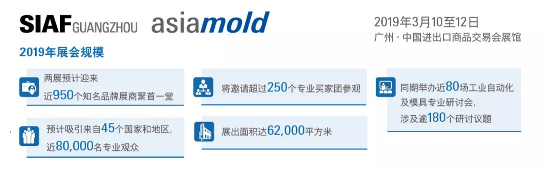SIAF广州工业自动化展历经九年磨练,一直处于华南智能制造行业前沿,促进产业技术互融与革新,至今已发展为不可缺席的行业年度盛会。2019年SIAF展会将再度与广州国际模具展览会(Asiamold)同期举行,于3月10至12日于广州中国进出口商品交易会展馆迎来世界各地的业内人士,展示应用领域涵盖汽车工程、家电制造、电子工程、机械工程、包装印刷、消费品、照明、纺织品、医疗器械等,绘画智能制造的未来蓝图。