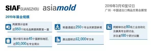 SIAF广州国际工业自动化技术及装备展览会将于2019年3月10至12日在广州中国进出口商品交易会琶洲展馆A区举行。秉承以往的成功之道,展会将再度与Asiamold广州国际模具展览会同场举行,吸引众多工业自动化和模具行业的精英,聚首探索行业动向。