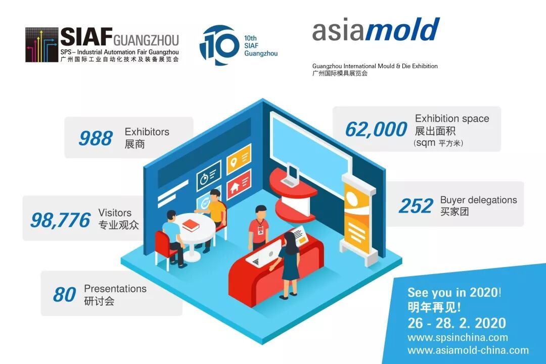 2019年SIAF展会踏入十周年里程碑,再度获得行业的广泛认同。本届展会一如既往与 Asiamold 广州国际模具展览会同期举行,并于3月12日顺利闭幕,为华南工业自动化行业、模具及增材制造带来一站式的采购机遇。在为期三天的展会中,SIAF 与 Asiamold 共获得来自20个国家及地区共988家展商莅临参展 (2018年数字:896家展商,来自20个国家及地区)。此外,两展更吸引98,776名来自45个国家及地区的专业买家到场,当中包括252个买家团,较去年同期大幅增加37%,成绩斐然。多项亮丽数据再次引证展会于行业的领先地位,足见两展已成为业内举足轻重的商贸平台,协助业界绽放商机。